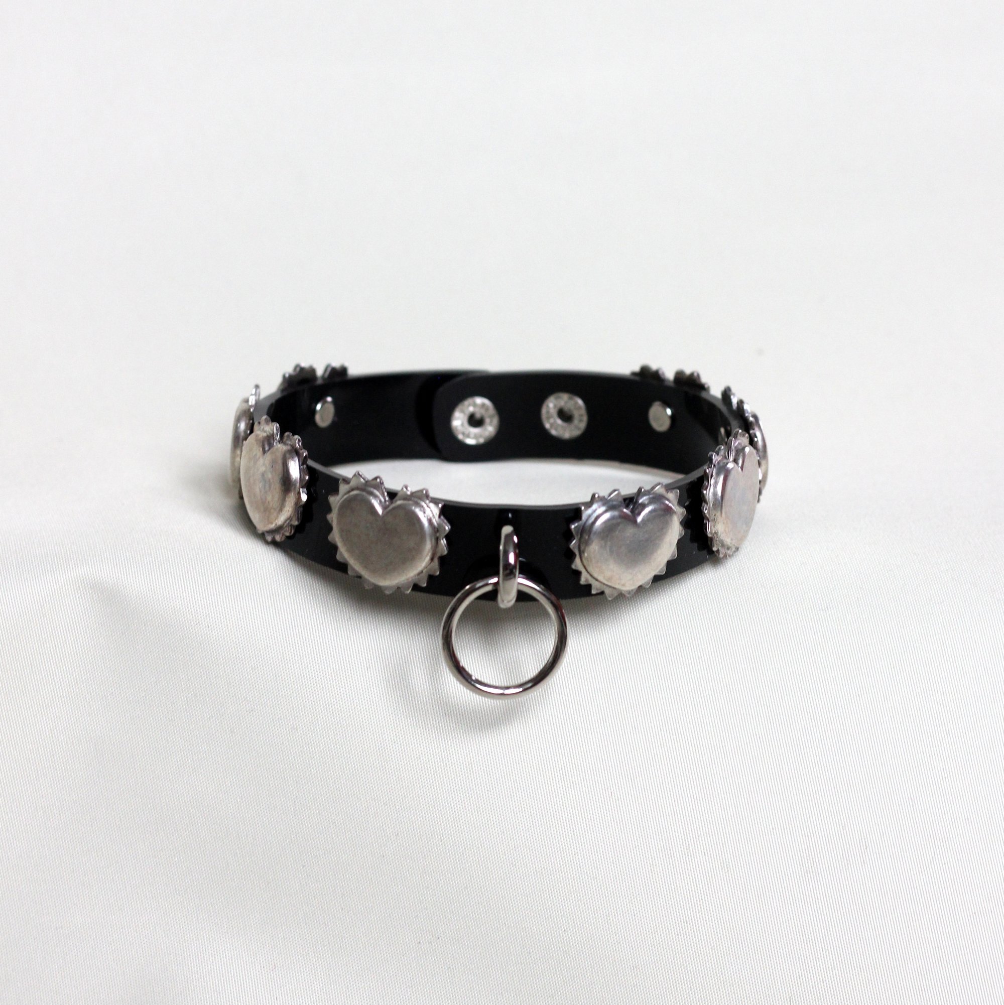 This choker is crafted from durable vegan PVC, featuring original vintage spiked heart studs with unique patina and an O-ring at the center. Closes securely with a snap button at the neck.